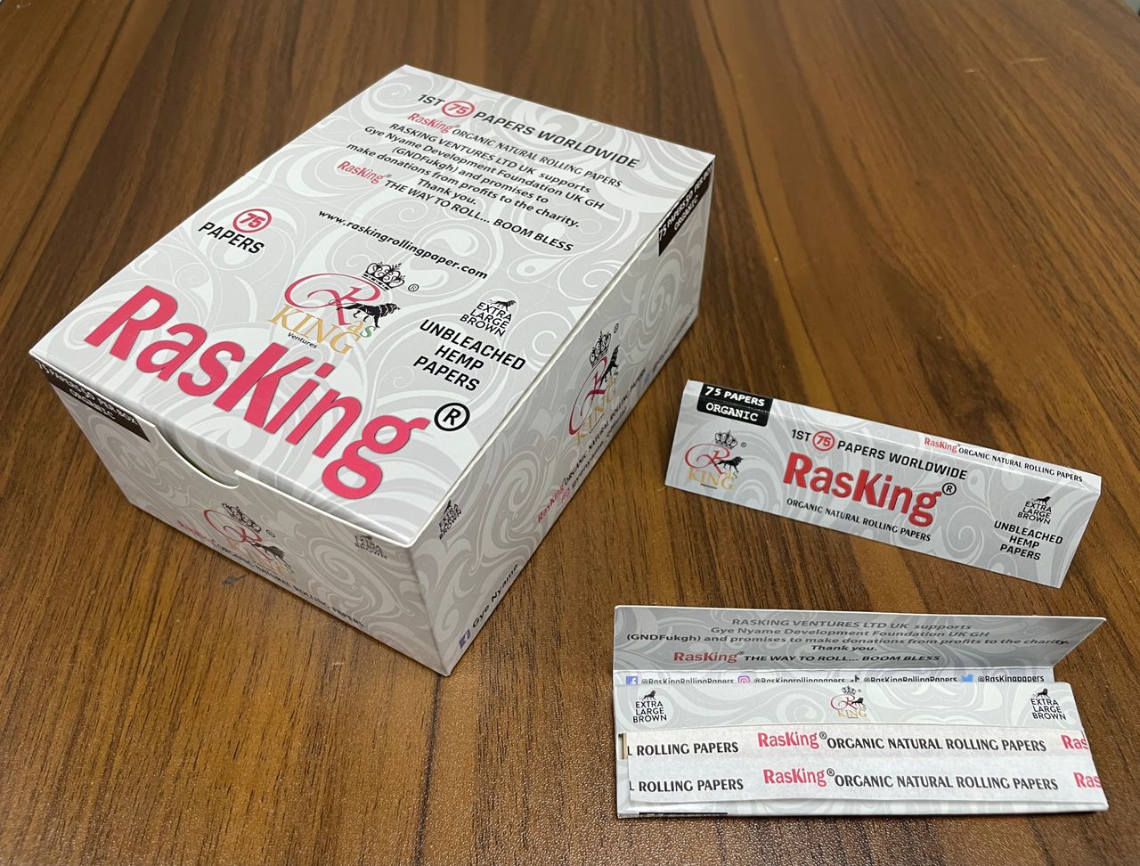 RasKing came out as personal changes to the standard 32 papers to 75 Extra large Brown. RasKing Organic Natural Rolling paper is the 1st 75 papers extra large Brown worldwide. We boast of our high-quality organic natural rolling paper and natural arabic gum to stick RasKing paper.RasKing Organic Natural Rolling paper cooperate social responsibility is the Main Sponsor of Gye Nyame Development Foundation ( GNDFukgh) registration number 1119482 UK & Ghana.
